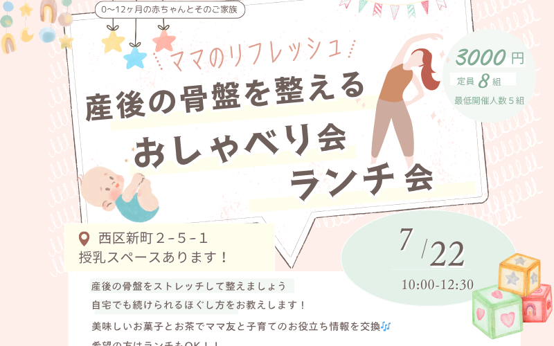 会場は西区になりますが、ママさん向けの骨盤矯正ストレッチ会を行います✨